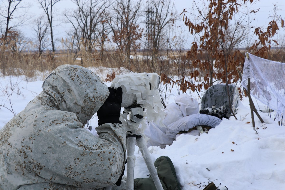 А началось всё с выполнения задания по скрытному размещению снайперских пар. Курсанты, пробираясь по сугробам, тщательно изучали рельеф, учитывали направление ветра, освещение и естественные укрытия. При этом каждая позиция должна быть невидимой не только для наземного наблюдателя, но и для воздушной разведки условного противника. Используя маскировочные сети, подручные материалы и особенности ландшафта, снайперы буквально «растворялись» на местности.