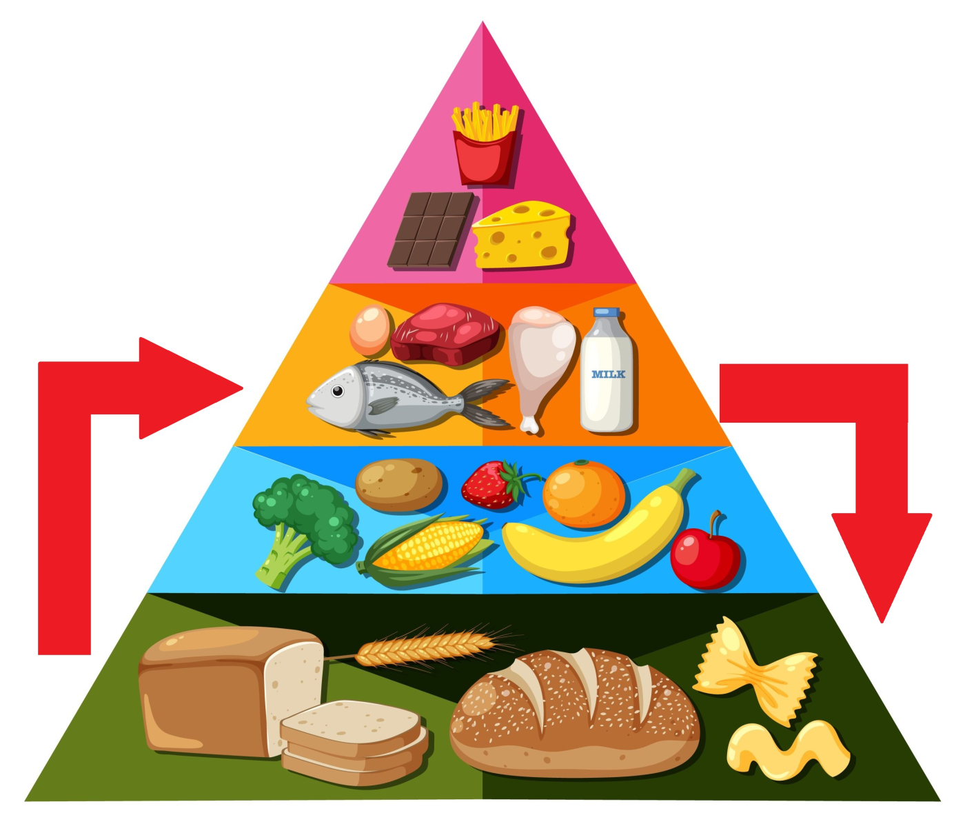 Раньше в основании пирамиды находились злаки и хлеб, а теперь — белки. И среди них красное мясо, птица, рыба, яйца, а также цельное молоко и кисломолочные продукты с естественной жирностью, такие как сыр и творог. Это первое отличие: раньше диетологи советовали выбирать обезжиренные продукты.