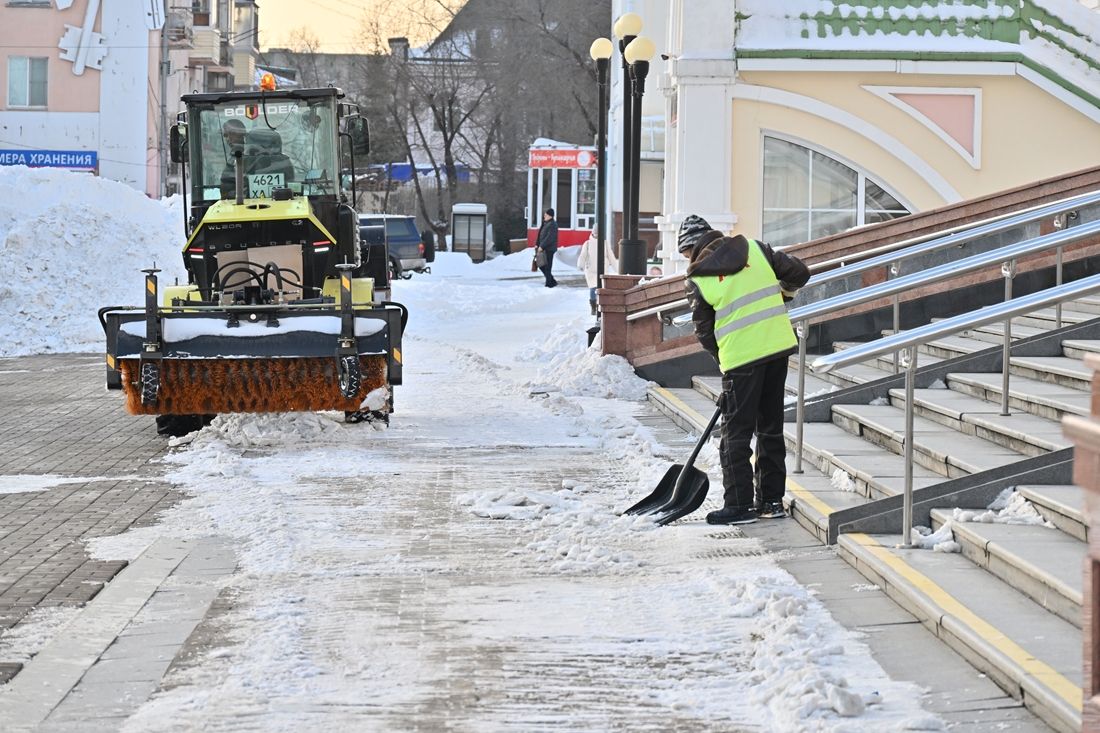 Работники МБУ «Восток» очищали от снега и наледи привокзальную площадь, Краснодарский проезд, спуск к Серышева от железнодорожного вокзала, остановку «Автовокзал», улицу Краснодарская, территорию у Краевой больницы № 1, Детской железной дороги и железнодорожного вокзала.