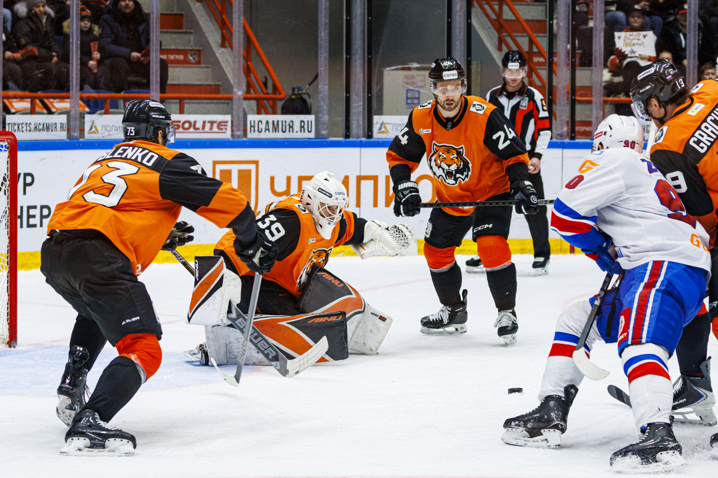 К сожалению, завершилась она в пользу гостей. Хотя практически до самого конца основного времени хабаровчане вели со счетом 1:0 (шайбу забросил Лихачев). Но за полторы минуты до финального свистка СКА установил равновесие, а в дополнительной пятиминутке забрал себе два очка, отдав «Амуру» лишь одно.