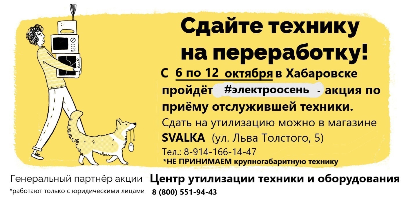 Ненужную технику можно приносить с 11.00 до 20.00 ежедневно по адресу: ул. Льва Толстого, 5, магазин SVALKA. Подробности по телефонам: 8-914-166-14-47, 8-914-540-60-26.— Принимаем любую нерабочую и рабочую малогабаритную технику размером до микроволновки: пылесосы, чайники, тостеры, фены, провода, удлинители, принтеры, ноутбуки, телефоны, наушники и многое другое, — отметил директор проекта SVALKA Евгений Корчагин. — Подобные акции проводим два раза в год. Это отличный шанс избавиться от ненужного электрохлама и заодно позаботиться о природе: то, что еще можно починить, найдет новых владельцев, а негодное к использованию разберут на детали.
